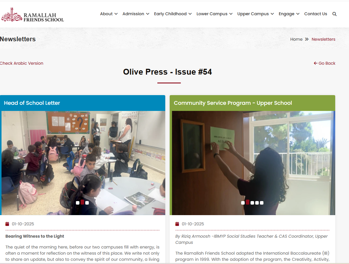 We share with you the 54th issue of the Olive Press, which is the first issue of our school newsletter for the 2025-2026 academic year, available in English and Arabic at this link.