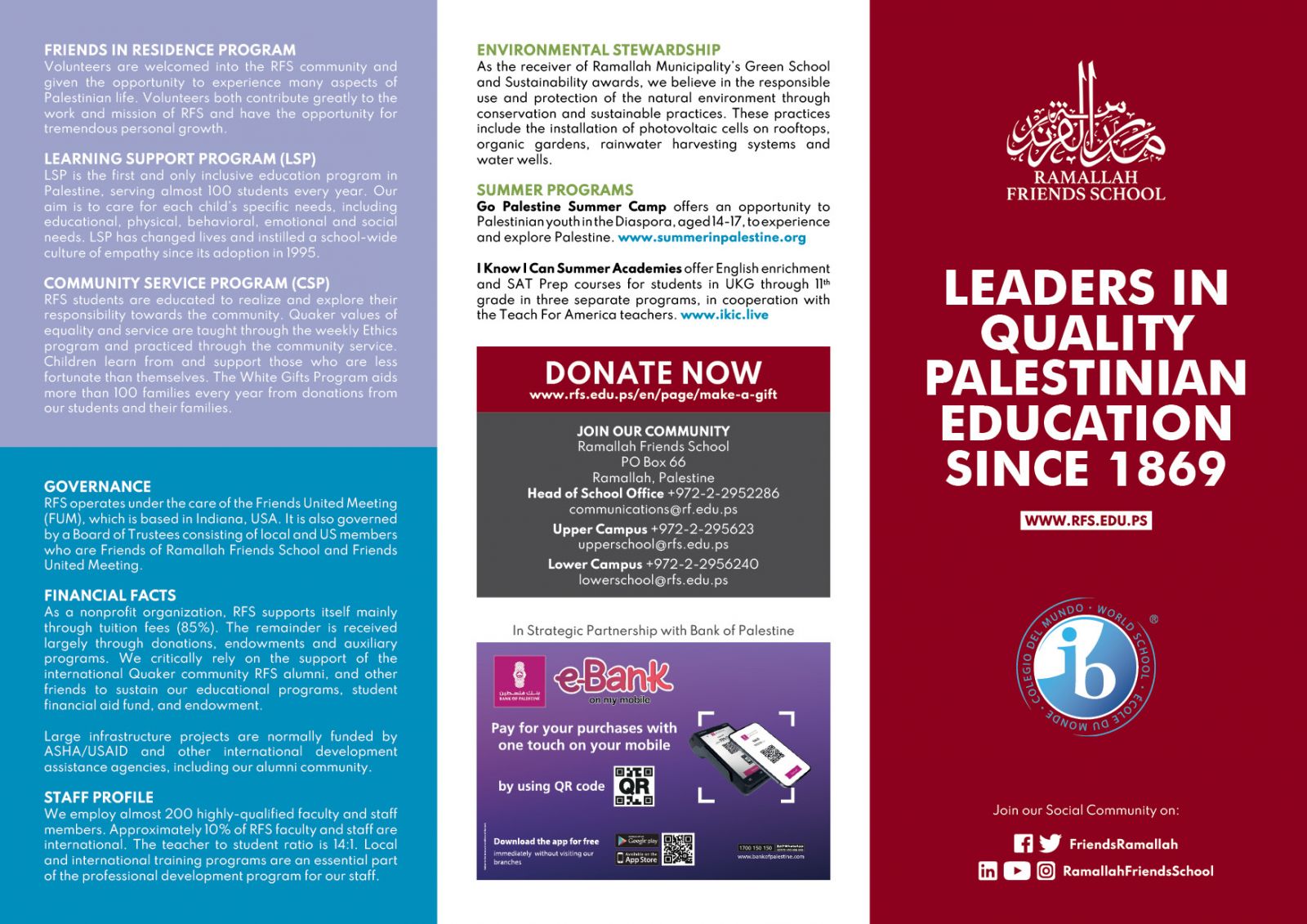 The Ramallah Friends School (RFS) is a Pre-Kindergarten through 12, co-educational Quaker school with two beautiful campuses in the neighboring towns of Ramallah and El-Bireh. RFS offers all students a wide range of academic and extracurricular activities that encourage students to become global thinkers and lifelong learners.