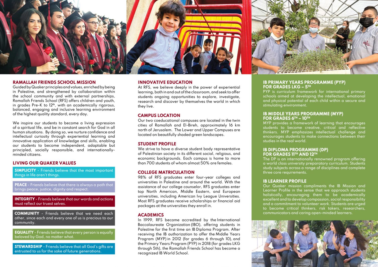RFS prides itself on its rigorous and world-class curricula. RFS is the only school in Palestine considered as an International Baccalaureate (IB) World School for it offers the Diploma Program for 11th and 12th grade students, the Middle Years Program for grades 6th through 10th, and the Primary Years Program (PYP) for grades LKG through 5th. From Kindergarten through 12th grade, students learn to think critically with global mindsets. RFS uses the Quaker principles as a guide in educating its students and the next generation of Palestinian leaders.